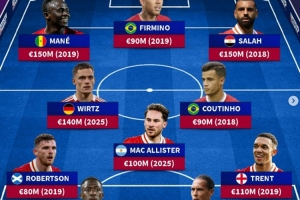 马内(2019年,1.5亿欧)、菲尔米诺(2019年,9000万欧)、萨拉赫(2018年,1.5亿欧)